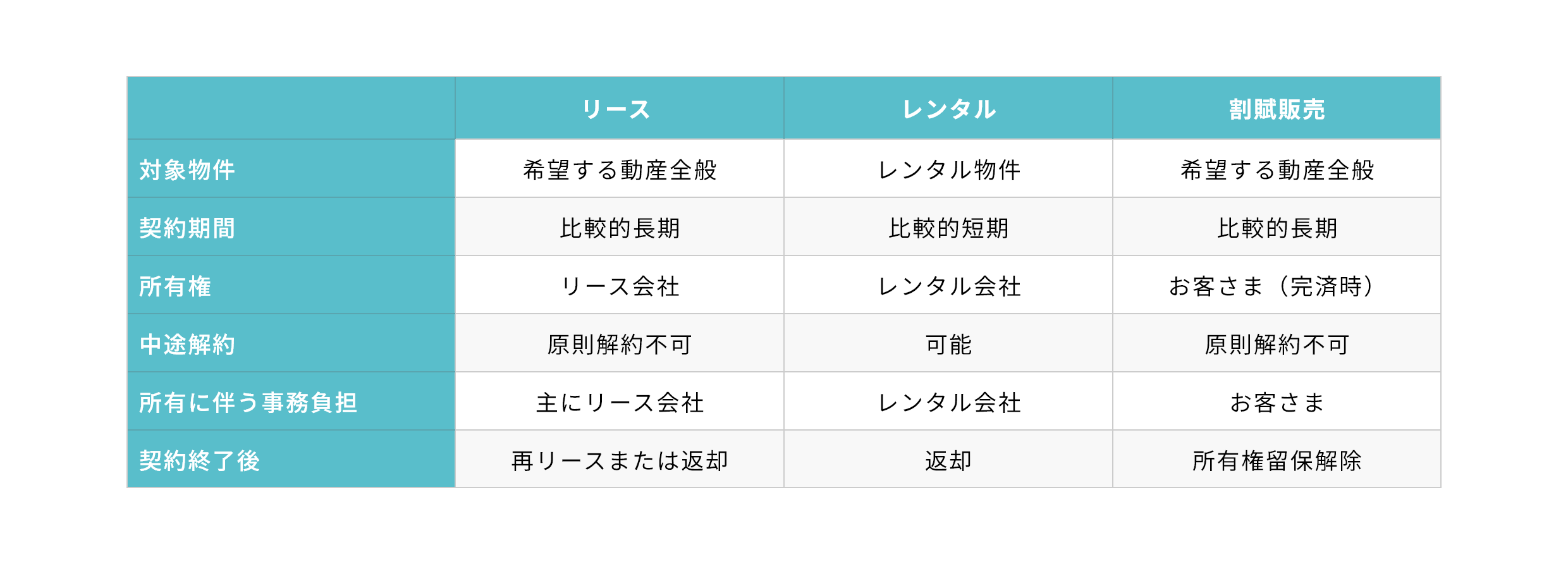 割賦販売の場合、契約開始時点で商品の所有権が購入者に移転せず、賦払金完済時までリース会社において留保します。